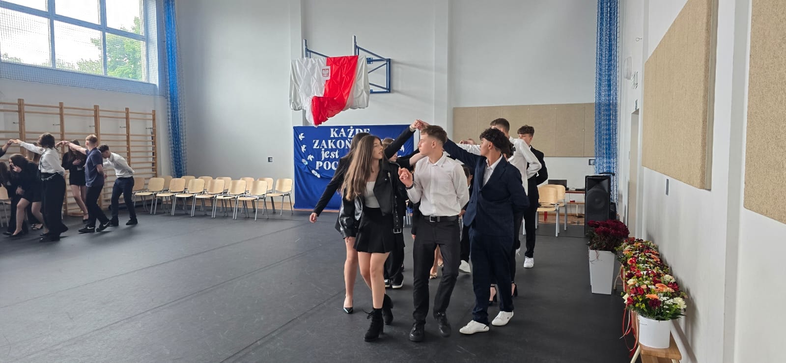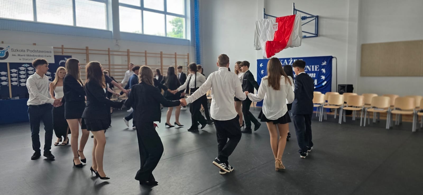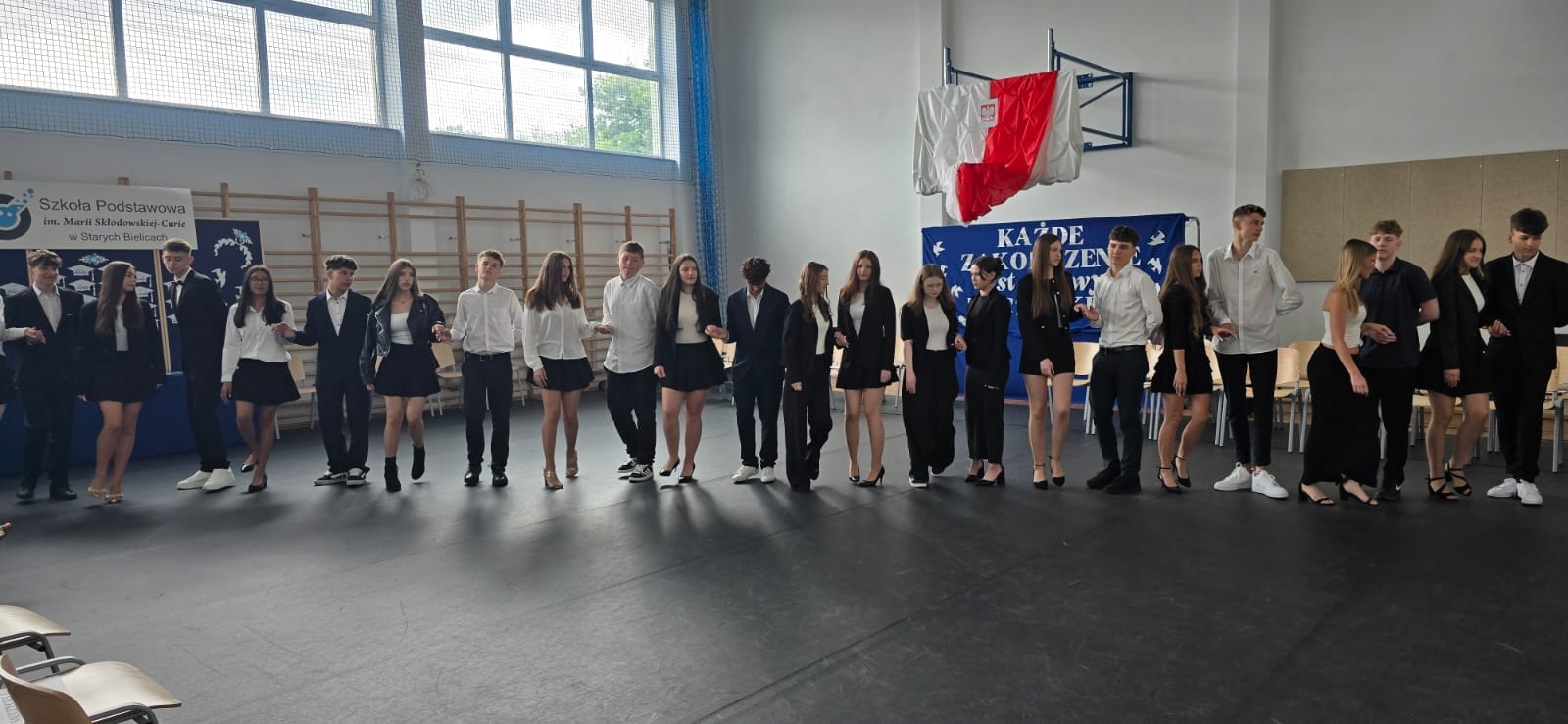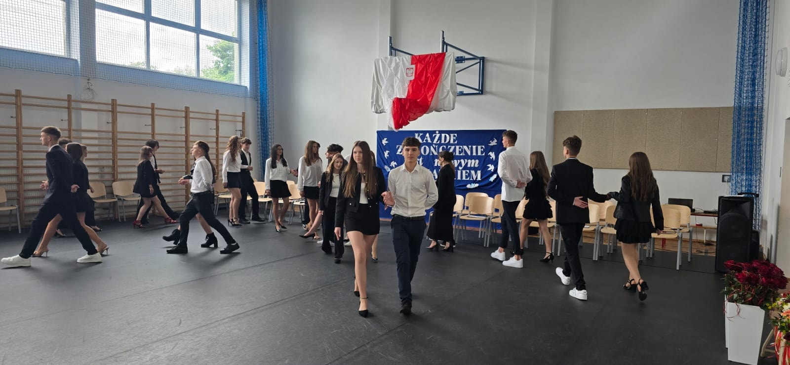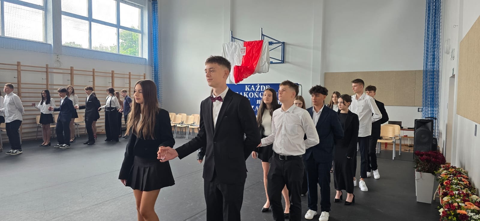 Nie zabrakło tradycyjnego poloneza, który uczniowie zatańczyli z ogromną gracją i dumą. Ten piękny taniec był symbolicznym pożegnaniem ze szkołą podstawową i wejściem w nowy etap życia.